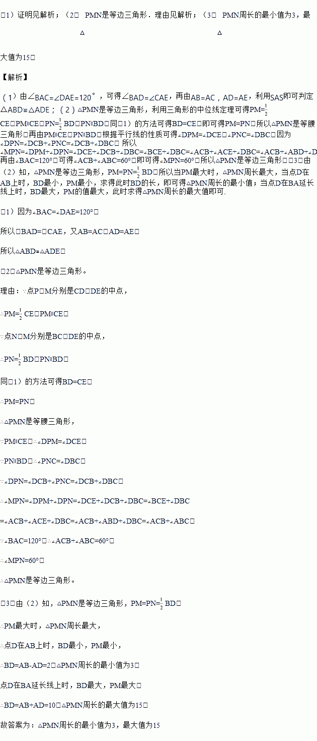 (3)在(2)中,把△ADE绕点A在平面内自由旋转,若AD=4,AB=6,请分别求出△PMN周长的最小值与最大值.