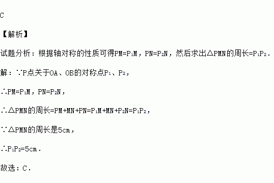 (2015秋•广元校级期中)如图,∠AOB内一点P,P1,P2分别是P关于OA、OB的对称点,P1P2交OA于点M,交OB于点N.若△PMN的周长是5cm,则P1P2的长为( )