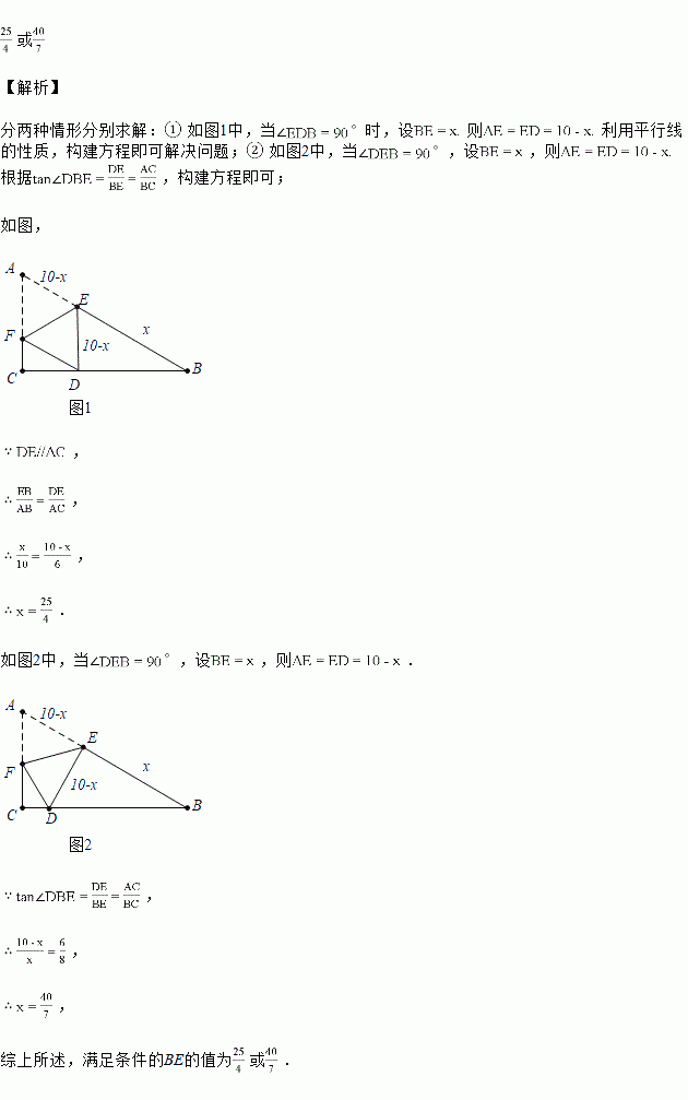 如图,在中,,,,点E,F分别为AB,AC上一个动点,连接EF,以EF为轴将折叠得到,使点D落在BC上,当为直角三角形时,BE的值为______.