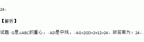 如果点G是△ABC的重心, AG的延长线交BC于点D, GD=12, 那么AG=________.