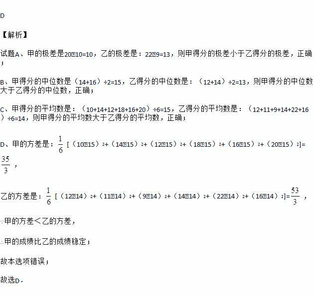 A. 甲得分的极差小于乙得分的极差 B. 甲得分的中位数大于乙得分的中位数