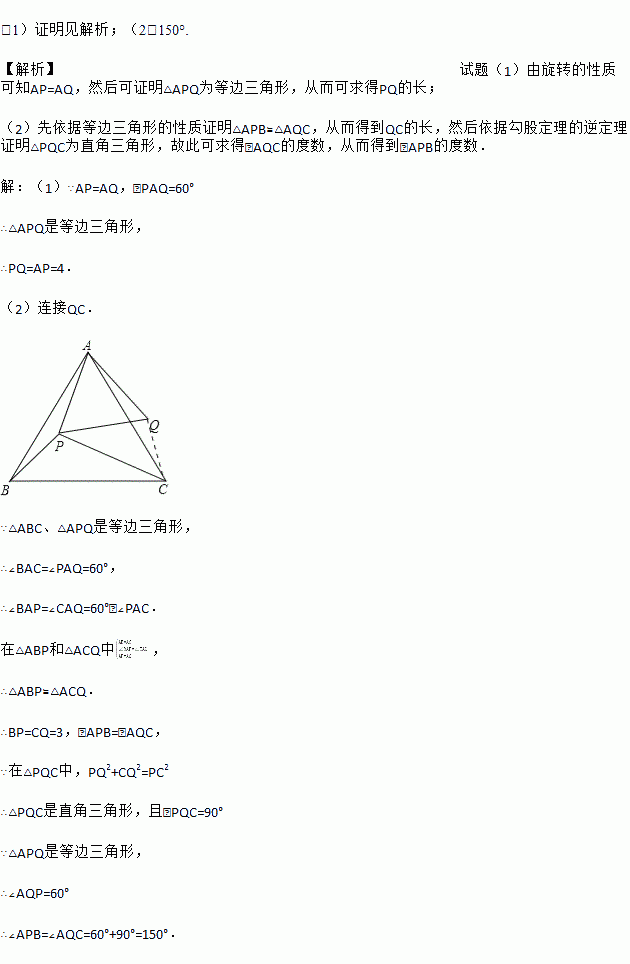 已知,点P是等边△ABC内一点,PA=4,PB=3,PC=5.线段AP绕点A逆时针旋转60°到AQ,连接PQ.(1)求PQ的长.(2)求∠APB的度数.