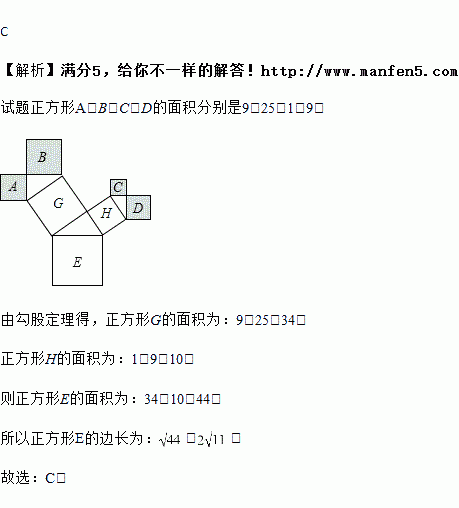 如图是一株美丽的勾股树,其中所有的四边形都是正方形,所有的三角形都是直角三角形,若正方形A、B、C、D的边长分别是9、25、1、9,则最大正方形E的边长是( )