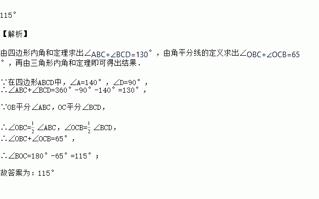如图,在四边形ABCD中,∠A=140°,∠D=90°,OB平分∠ABC,OC平分∠BCD,则∠BOC=_____.