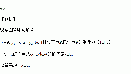 如图,直线y1=-x+a与y2=bx-4相交于点P,已知点P的坐标为(1,-3),则关于x的不等式-x+a<bx-4的解集是_______.