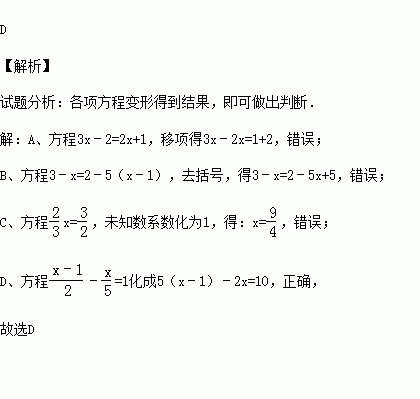 A.方程3x﹣2=2x+1,移项,得3x﹣2x=﹣1+2