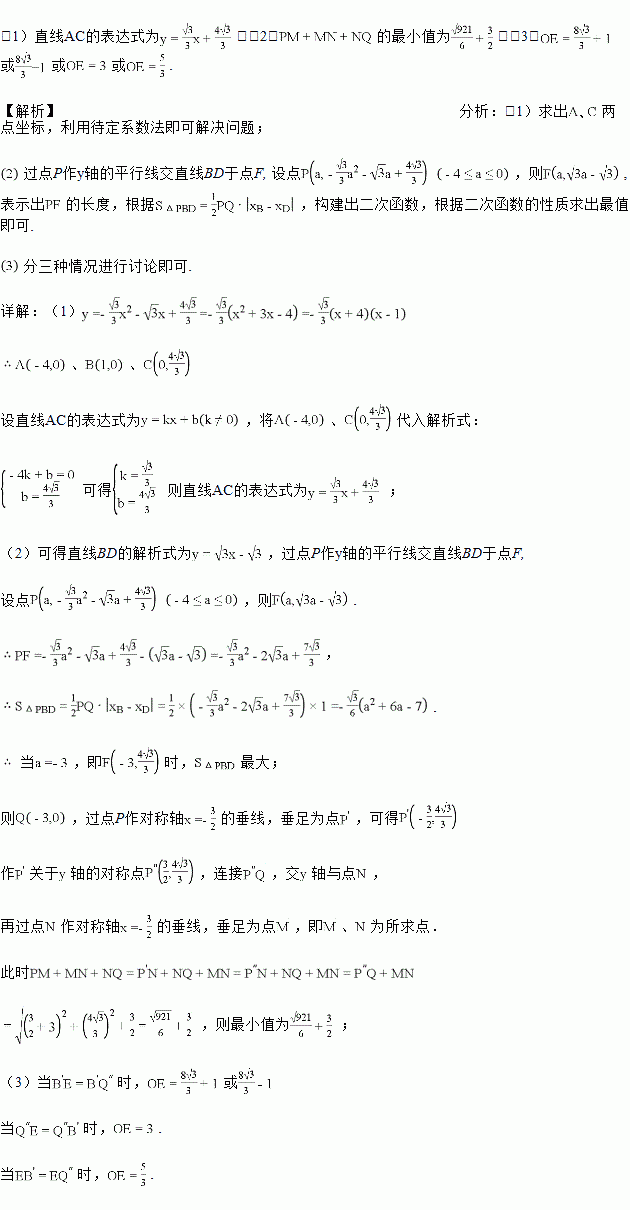 (2)如图1,P为直线AC上方抛物线上的一动点,当△PBD的面积最大时,过P作PQ⊥x轴于点Q,M为抛物线对称轴上的一动点,过M作y轴的垂线,垂足为点N,连接PM、NQ,求PM+MN+NQ的最小值;