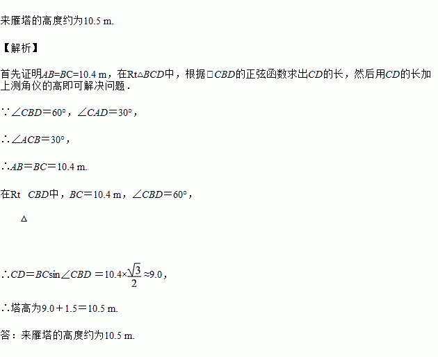 衡阳市城市标志来雁塔坐落在衡阳市雁峰公园内.如图,为了测量来雁塔的高度,在E处用高为1.5 m的测角仪AE,测得塔顶C的仰角为30°,再向塔身前进10.4 m,又测得塔顶C的仰角为60°,求来雁塔的高度.(结果精确到0.1 m)