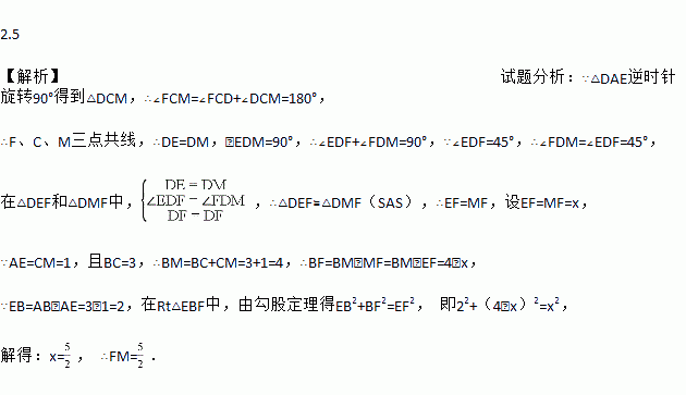 如图,已知正方形ABCD的边长为3,E、F分别是AB、BC边上的点,且∠EDF=45°,将△DAE绕点D逆时针旋转90°,得到△DCM.若AE=1,则FM的长为 .