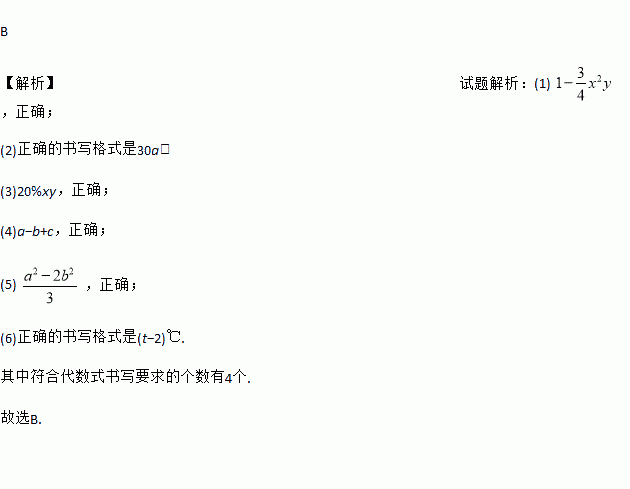 B 【解析】试题解析:(1) ,正确; (2)正确的书写格式是30a; (3)20%xy,正确; (4)a?b+c,正确; (5) ,正确; (6)正确的书写格式是(t?2)℃. 其中符合代数式书写要求的个数有4个. 故选B.