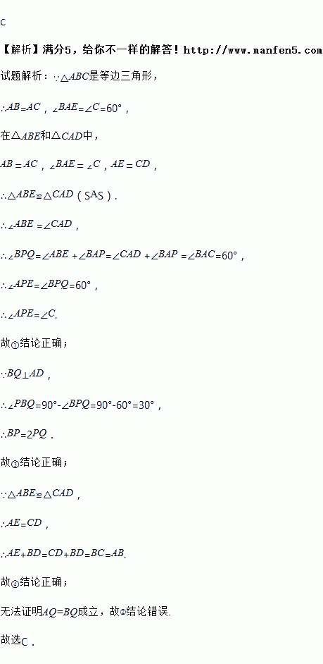 已知,如图,△ABC是等边三角形,AE=CD,BQ⊥AD于Q,BE交AD于点P,下列说法:①∠APE=∠C,②AQ=BQ,③BP=2PQ,④AE+BD=AB,其正确的个数有( )个.