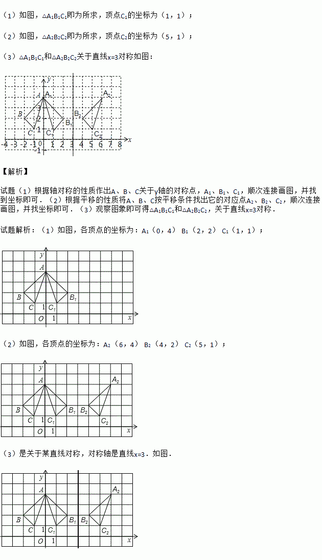(3)观察△A1B1C和△A2B2C2,它们是否关于某直线对称?若是,请用实线条画出对称轴。