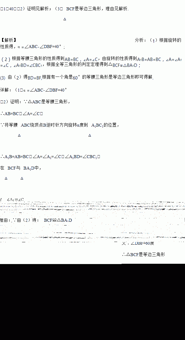 如图,等腰△ABC中,AB=BC,将△ABC绕顶点B逆时针方向旋转度到△A1BC1的位置,AB与A1C1相交于点D,AC与A1C1、BC1分别交于点E、F.![]()