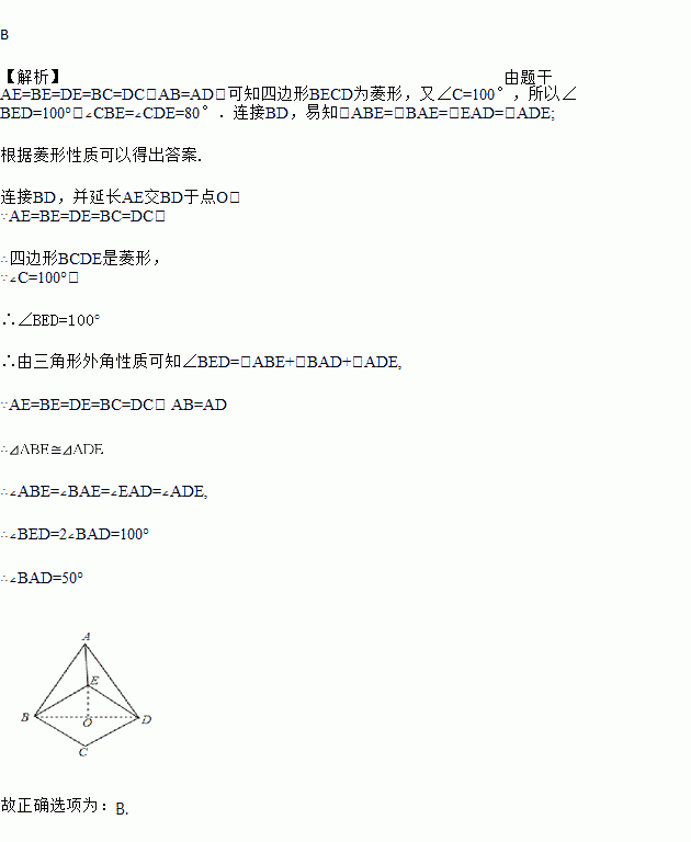 如图,四边形ABCD内有一点E,AE=BE=DE=BC=DC,AB=AD,若∠C=100°,则∠BAD的大小是( )