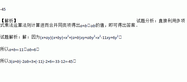 -45 【解析】试题分析:直接利用多项式乘法运算法则计算进而合并同类项得出a+b,ab的值,即可得出答案. 试题解析:【解析】 因为(x+ay)(x+by)=x2+(a+b)xy+aby2=x2-11xy+6y2, 所以a+b=-11,ab=6. 所以3(a+b)-2ab=3×(-11)-2×6=-33-12=-45.