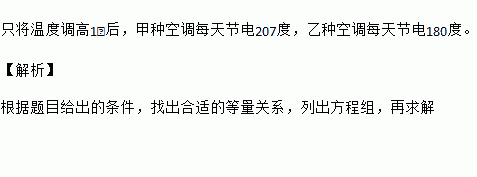 夏季,为了节约用电,常对空调采取调高设定温度和清洗设备两种措施。某宾馆先把甲、乙两种空调的设定温度都调高1℃,结果甲种空调比乙种空调每天多节电27度;再对乙种空调清洗设备,使得乙种空调每天的总节电量是只将温度调高1℃后的节电量的1.1倍,而甲种空调节电量不变,这样两种空调每天共节电405度。求只将温度调高1℃后两种空调每天各节电多少度?