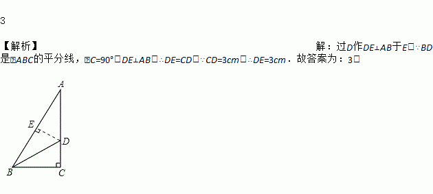 如图,Rt△ABC中,∠C=90°,∠ABC的平分线BD交AC于点D,若CD=3cm,则点D到AB的距离是_________cm.