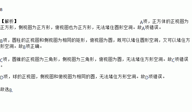 如图是一块带有圆形空洞和方形空洞的小木板,则以右侧物体作为塞子,既可以堵住圆形空洞又可以堵住方形空洞的是( )