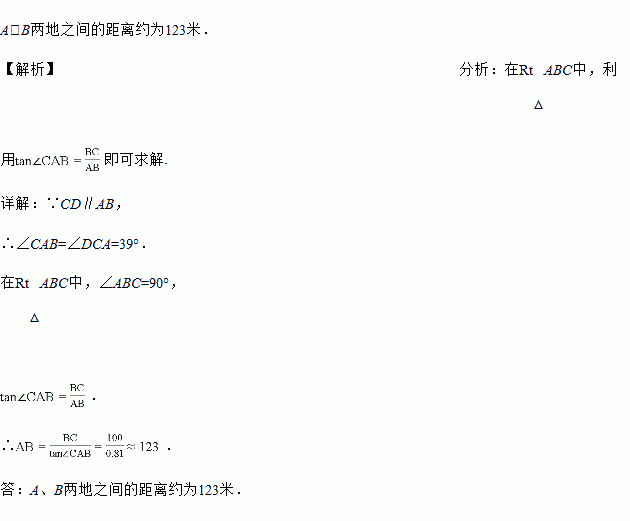 如图,某地修建高速公路,要从A地向B地修一座隧道(A、B在同一水平面上),为了测量A、B两地之间的距离,某工程师乘坐热气球从B地出发,垂直上升100米到达C处,在C处观察A地的俯角为39°,求A、B两地之间的距离.(结果精确到1米)