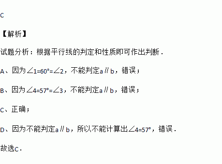 C.因为∠2=∠5,又∠1=60º,∠2=60º,故∠1=∠5=60º,所以a∥b,所以∠4=∠3=57º