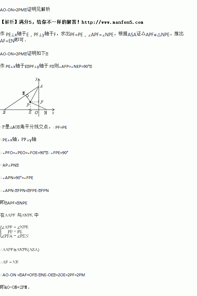 如图,在平面直角坐标系中,OA=OB,点P为△ABO的角平分线的交点,若PN⊥PA交x轴于N,延长OP交AB于M,写出AO,ON,PM之间的数量关系,并证明之.