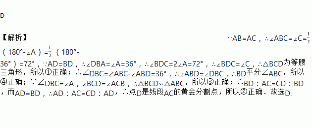 等腰△ABC中,AB=AC,∠A=36°,D是AC上的一点,AD=BD,则以下结论中正确的有( )