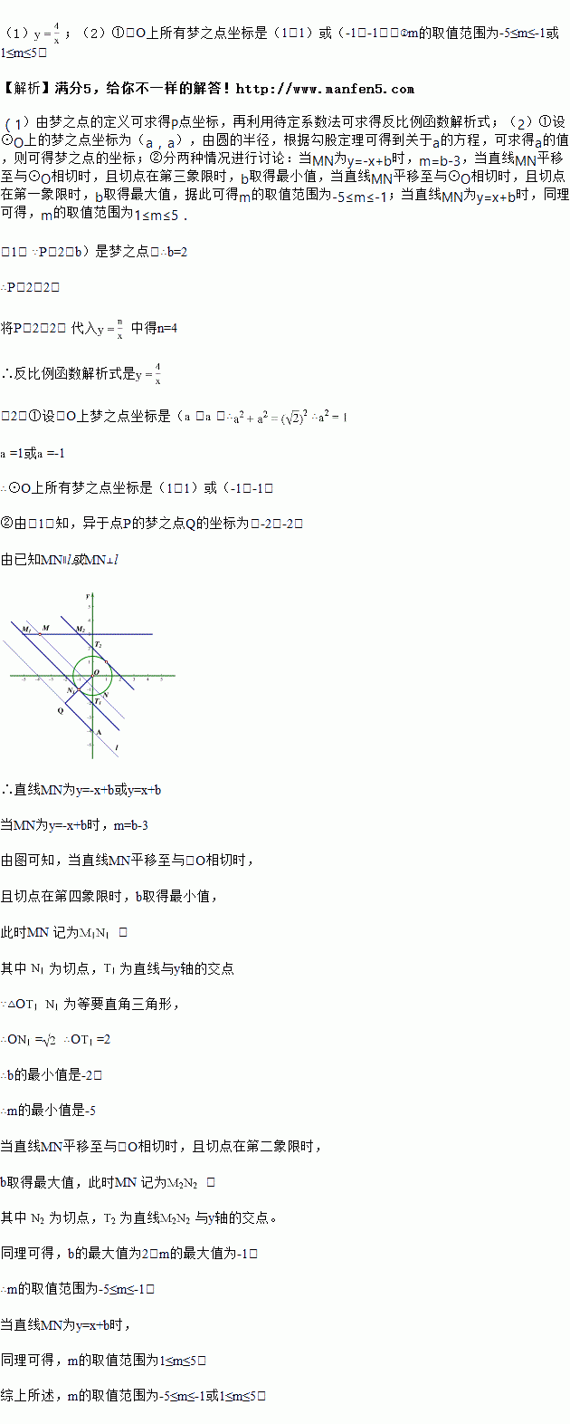 图象上异于点 P 的梦之点,过点Q 的直线 l 与 y 轴交于点 A,∠OAQ=45°.若在⊙ O 上存在一点 N,使得直线 MN ∥ l或 MN ⊥ l,求出 m 的取值范围.