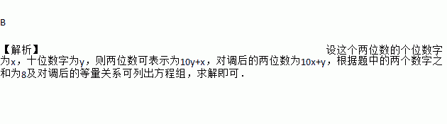 一个两位数的十位数字与个位数字的和是8,把这个两位数加上18,结果恰好成为数字对调后组成的两位数,求这个两位数.设个位数字为x,十位数字为y,所列方程组正确的是( )