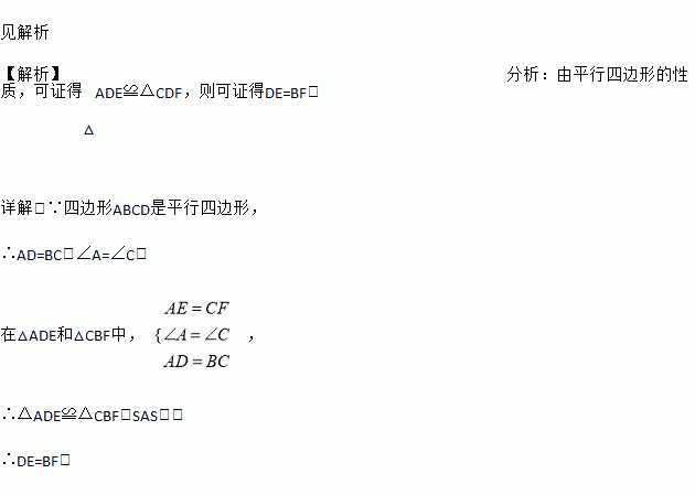 如图,平行四边形ABCD中,E、F是AB、CD边上的点,AE=CF,求证:DE=BF.