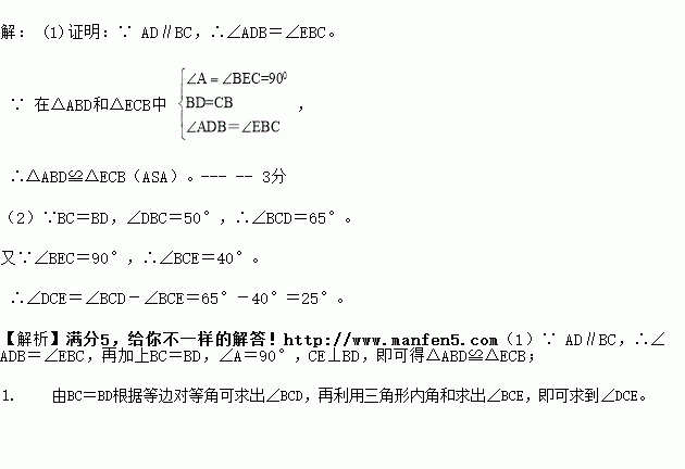 如图,已知四边形ABCD是梯形,AD∥BC,∠A=90°,BC=BD,CE⊥BD,垂足为E.