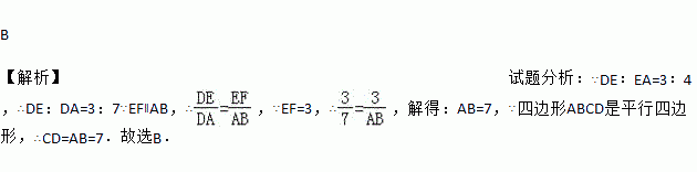 B 【解析】试题分析:∵DE:EA=3:4,∴DE:DA=3:7∵EF∥AB,∴,∵EF=3,∴,解得:AB=7,∵四边形ABCD是平行四边形,∴CD=AB=7.故选B.