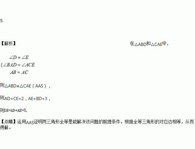 如图,Rt△ABC中,∠BAC=90?,AB=AC,分别过点B. C作过点A的垂线BC、CE,垂足分别为D、E,若BD=3,CE=2,则DE=__________.