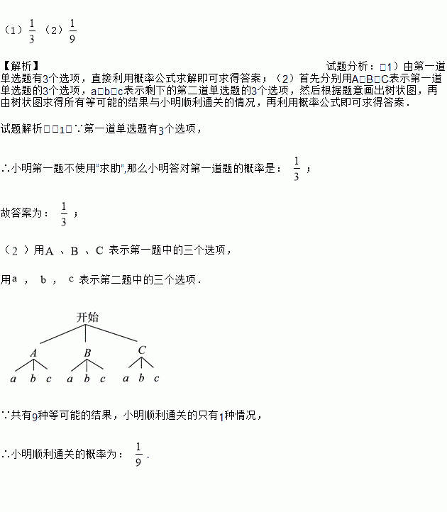 (1)(2) 【解析】试题分析:(1)由第一道单选题有3个选项,直接利用概率公式求解即可求得答案;(2)首先分别用A,B,C表示第一道单选题的3个选项,a,b,c表示剩下的第二道单选题的3个选项,然后根据题意画出树状图,再由树状图求得所有等可能的结果与小明顺利通关的情况,再利用概率公式即可求得答案. 试题解析:(1)∵第一道单选题有3个选项, ∴小明第一题不使用“求助”,那么小明...
