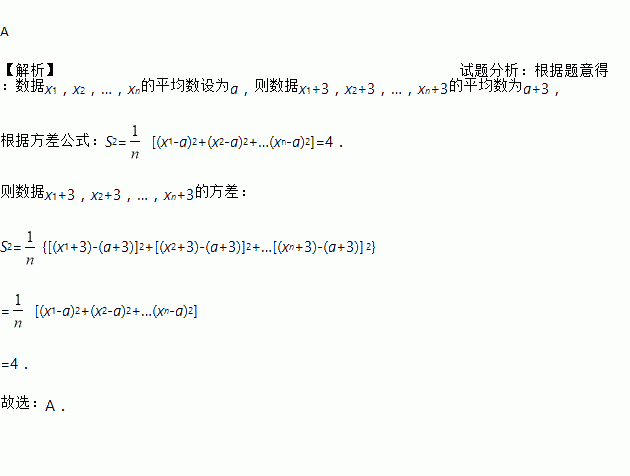 A 【解析】试题分析:根据题意得:数据x1,x2,…,xn的平均数设为a,则数据x1+3,x2+3,…,xn+3的平均数为a+3, 根据方差公式:S2= [(x1-a)2+(x2-a)2+…(xn-a)2]=4. 则数据x1+3,x2+3,…,xn+3的方差: S2={[(x1+3)-(a+3)]2+[(x2+3)-(a+3)]2+…[(xn+3)-(a+3)] 2} ...