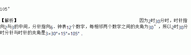 105° 【解析】因为2时30分时,时针指向2与3的中间,分针指向6.钟表12个数字,每相邻两个数字之间的夹角为30°,所以2时30分时分针与时针的夹角是3×30°+15°=105°.