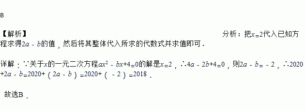 若关于x的一元二次方程ax2﹣bx+4=0的解是x=2,则2020+2a﹣b的值是( )