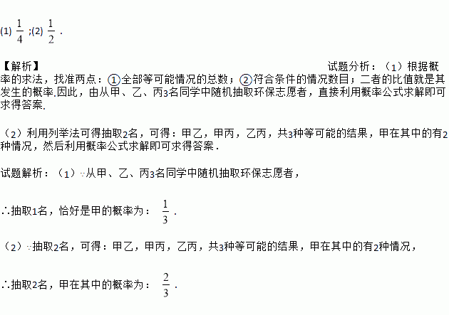 (1) ;(2) . ¡¾½âÎö¡¿ÊÔÌâ·ÖÎö£º£¨1£©¸ù¾Ý¸ÅÂʵÄÇ󷨣¬ÕÒ×¼Á½µã£º¢ÙÈ«²¿µÈ¿ÉÄÜÇé¿öµÄ×ÜÊý£»¢Ú·ûºÏÌõ¼þµÄÇé¿öÊýÄ¿£»¶þÕߵıÈÖµ¾ÍÊÇÆä·¢ÉúµÄ¸ÅÂÊ.Òò´Ë£¬ÓɴӼס¢ÒÒ¡¢±û3ÃûͬѧÖÐËæ»ú³éÈ¡»·±£Ö¾Ô¸Õߣ¬Ö±½ÓÀûÓøÅÂʹ«Ê½Çó½â¼´¿ÉÇóµÃ´ð°¸. £¨2£©ÀûÓÃÁоٷ¨¿ÉµÃ³éÈ¡2Ãû£¬¿ÉµÃ£º¼×ÒÒ£¬¼×±û£¬ÒÒ±û£¬¹²3ÖֵȿÉÄܵĽá¹û£¬¼×ÔÚÆäÖеÄÓÐ2ÖÖÇé¿ö£¬È»ºóÀûÓøÅÂʹ«Ê½Çó½â¼´¿ÉÇóµÃ´ð°¸£® ÊÔÌâ½âÎö£º£¨1£©¡ß...