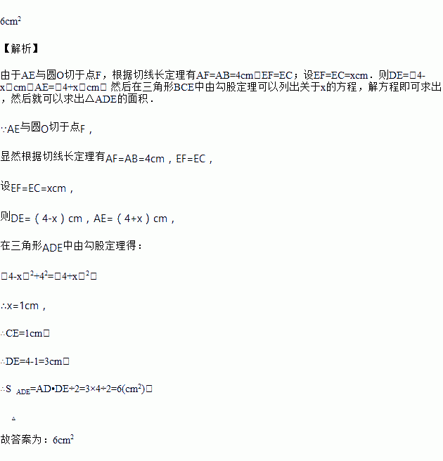 如图,正方形ABCD的边长为4cm,以正方形的一边BC为直径在正方形ABCD内作半圆,过A作半圆的切线,与半圆相切于F点,与DC相交于E点,则△ADE的面积为_______.