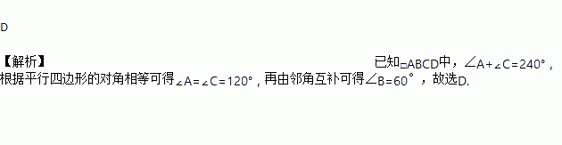 已知□ABCD中,∠A+∠C=240°,则∠B的度数是( ).