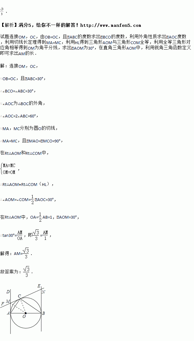 如图,已知AB为⊙O的直径,AB=2,AD和BE是圆O的两条切线,A、B为切点,过圆上一点C作⊙O的切线CF,分别交AD、BE于点M、N,连接AC、CB,若∠ABC=30°,则AM= .