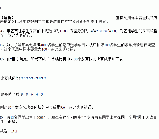 A. 甲乙两组学生身高的平均数均为1.58,方差分别为S甲2=2.3,S乙2=1.8,则甲组学生的身高较整齐