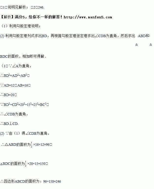 如图所示,在四边形ABCD中,∠A为直角,AB=16,BC=25,CD=15,AD=12,