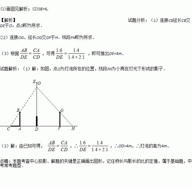 (2)如果小明的身高AB=1.6m,他的影子长AC=1.4m,且他到路灯的距离AD=2.1m,求灯泡的高.