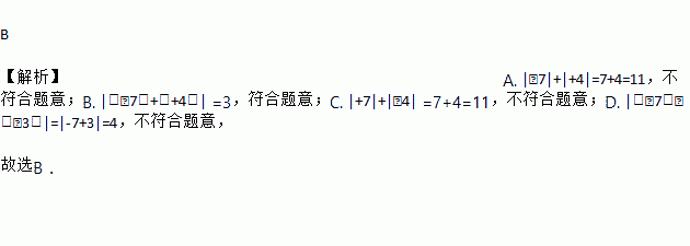 B 【解析】A. |﹣7|+|+4|=7+4=11,不符合题意;B. |(﹣7)+(+4)| =3,符合题意;C. |+7|+|﹣4| =7+4=11,不符合题意;D. |(﹣7)﹣(﹣3)|=|-7+3|=4,不符合题意, 故选B.