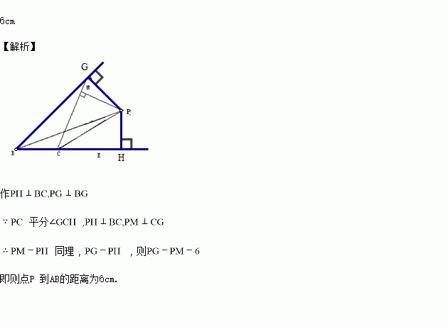 如图,△ABC中,∠ABC与∠ACB的外角平分线交于P,PM⊥AC于M,若PM=6cm,则点P到AB的距离为__________.