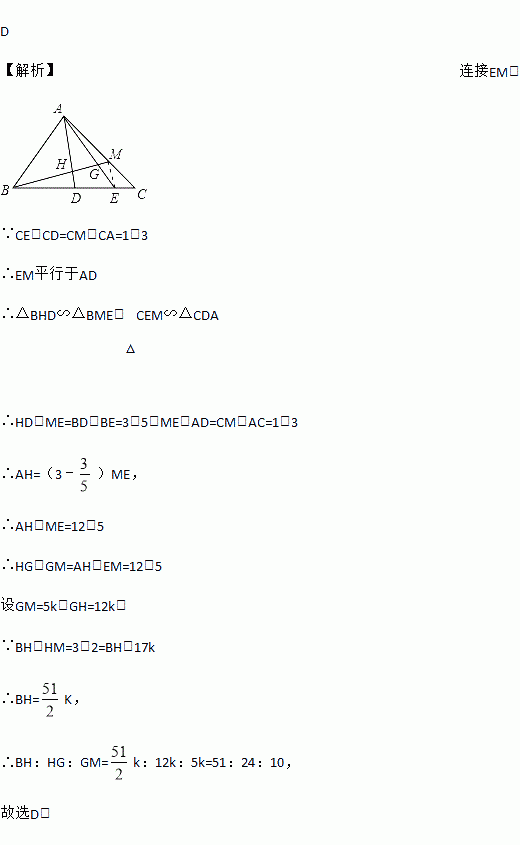 D 【解析】连接EM, ∵CE:CD=CM:CA=1:3 ∴EM平行于AD ∴△BHD∽△BME,△CEM∽△CDA ∴HD:ME=BD:BE=3:5,ME:AD=CM:AC=1:3 ∴AH=(3﹣)ME, ∴AH:ME=12:5 ∴HG:GM=AH:EM=12:5 设GM=5k,GH=12k, ∵BH:HM=3:2=BH:17k ...