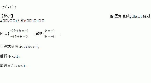 如图,直线y=kx+b经过A(-2,-1)和B(-3,0)两点,则不等式-3≤-2x-5<kx+b的解集是_______________。