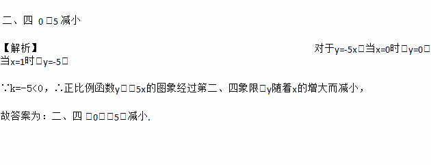正比例函数y=-5x的图象经过第________象限,经过点(0,________)与点(1,________),y随x的增大而________.