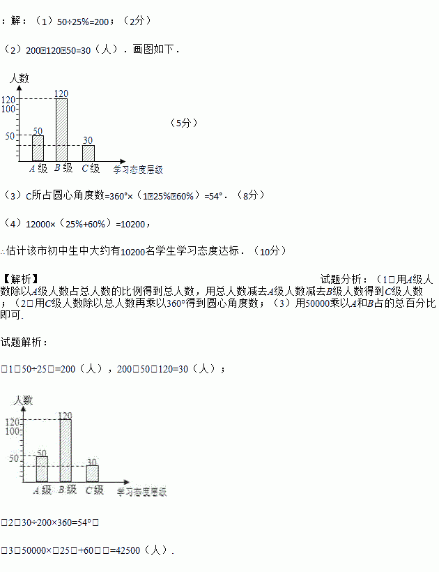 (4)根据抽样调查结果,请你估计我市近8000名八年级学生中大约有多少名学生学习态度达标(达标包括A级和B级)?