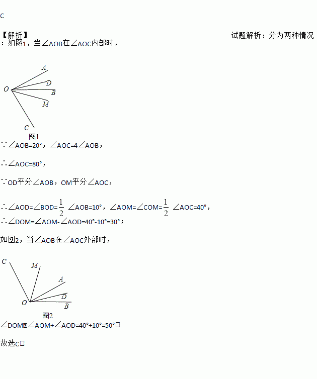C 【解析】试题解析:分为两种情况:如图1,当∠AOB在∠AOC内部时, ∵∠AOB=20°,∠AOC=4∠AOB, ∴∠AOC=80°, ∵OD平分∠AOB,OM平分∠AOC, ∴∠AOD=∠BOD=∠AOB=10°,∠AOM=∠COM=∠AOC=40°, ∴∠DOM=∠AOM-∠AOD=40°-10°=30°; 如图2,当∠AOB在∠AOC外部时, ∠DOM═∠AO...